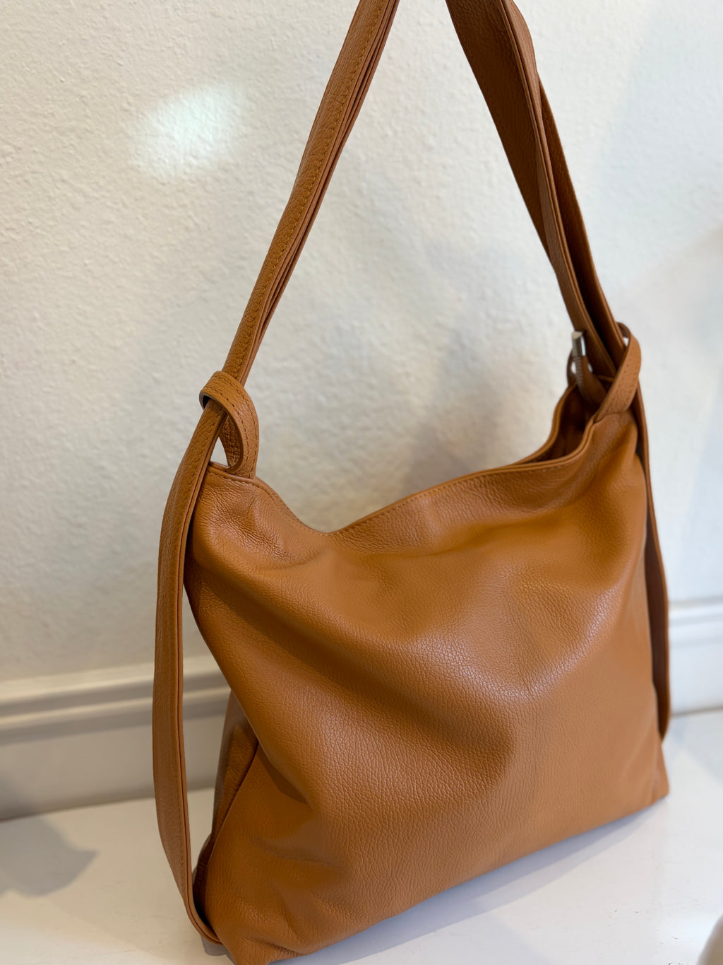 This versatile bag can function as a shoulder tote, or you can adjust the straps into a backpack! It features a top zip closure, small interior zip pocket, large interior zip pocket, and 2 interior slip pockets, measuring approximately 17" x 14" x 2". Handcrafted in a luxury leather shop in Florence, Italy.