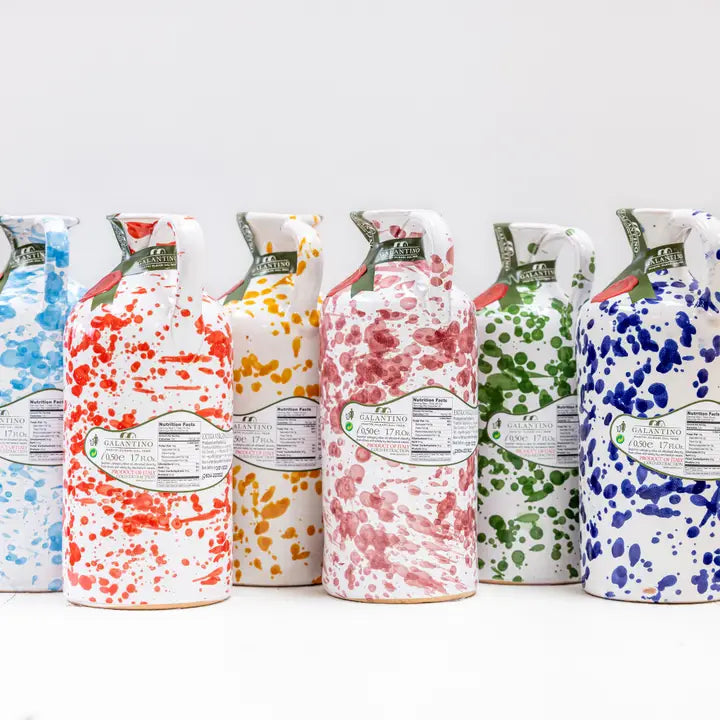 The “Fantasia" ceramic bottle comes in a variety of colors and patterns and is hand-painted by local artisans of the Puglia region of Italy, where the award-winning Frantoio Galantino olive mill is located. It is filled with their delicious and authentic extra virgin olive oil made from Ogliarola and Coratina olives. Golden yellow-green in color and well balanced flavors of almond and artichoke make this an ideal extra virgin olive oil for everyday use.